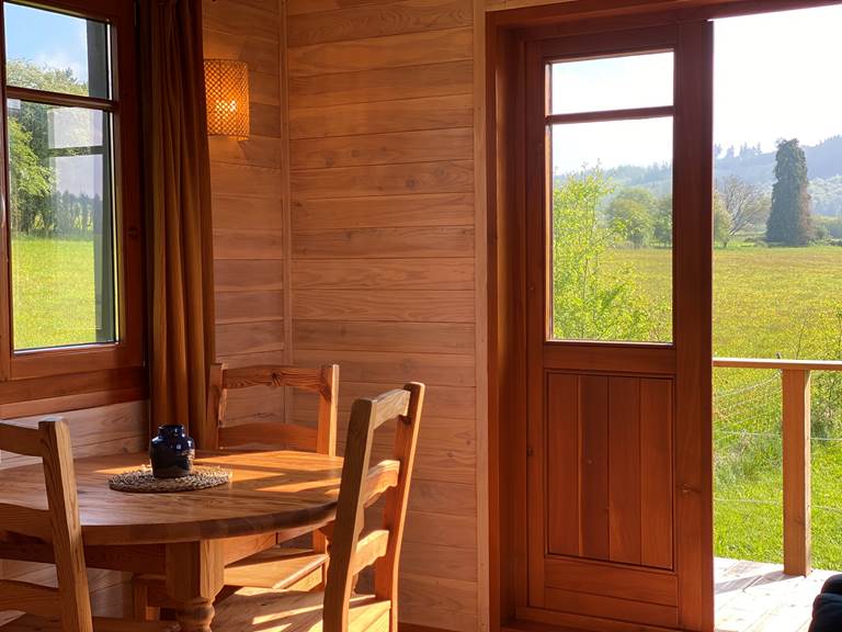 La Roulotte du Verger has been designed to make you feel comfortable in a peaceful atmosphere and healthy materials .